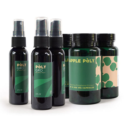 Apple Poly capsules help restore the internal conditions necessary for healthy hair: reducing systemic inflammation, balancing hormones, improving blood flow, and reversing cellular damage that can shrink or deactivate follicles. Meanwhile, Poly-GRO delivers a high dose of clinically studied procyanidin B2 directly to the scalp, where it stimulates growth, thickens existing strands, and improves follicle density—without drugs, irritation, or unwanted side effects.